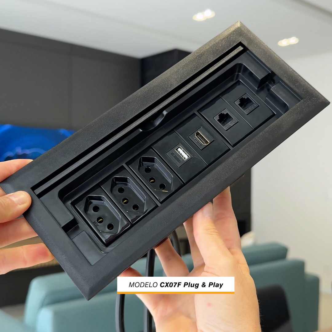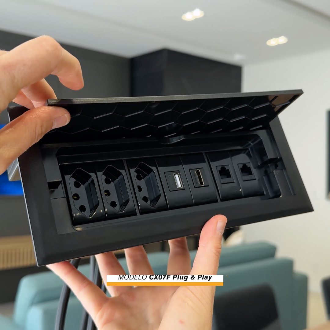 Com excelente custo-benefício este modelo de caixa tomada possui 3 tomadas 10A (ideal para celular, notebook, impressora, tablet, etc) + USB Carregador 10W + 1 HDMI Fêmea/Fêmea + 2RJ-45 CAT6 Rede (precisa crimpar) e cabo plug (1,5 metros) para você ligar e usar. O modelo possui tampa retrátil que quando aberta fica oculta dentro da caixa.