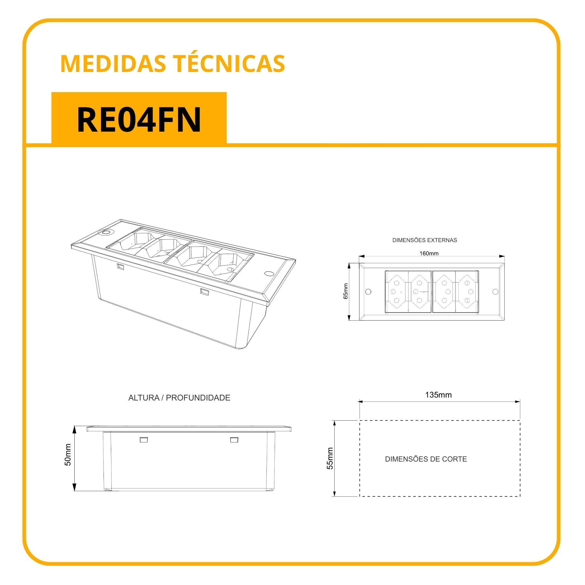 – Dimensional de corte para instalação: 54mm (L) x 50mm (P) x 135mm (C)