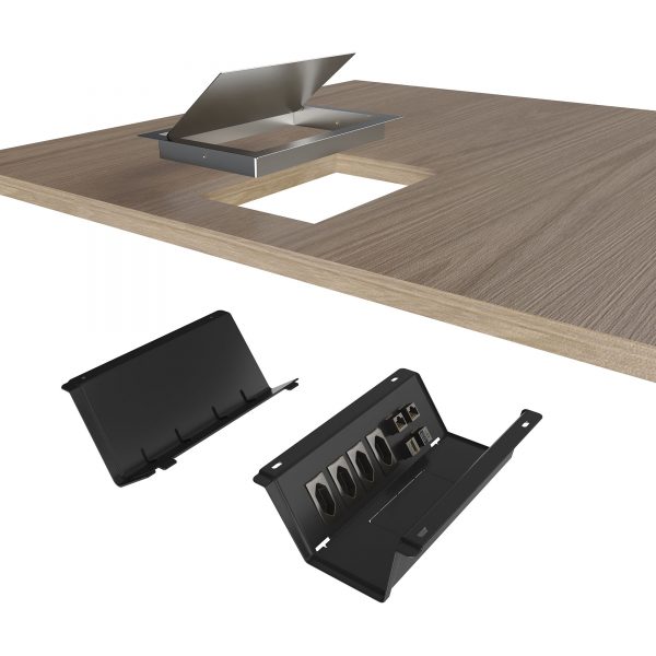 Esta caixa tomada é indicada para montagem em mesas de reunião, salas de conferência, salas de treinamento, showrooms e escritórios. O produto proporciona ao usuário praticidade na hora de fazer as conexões elétricas, de vídeo, de dados e rede.