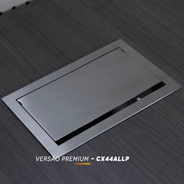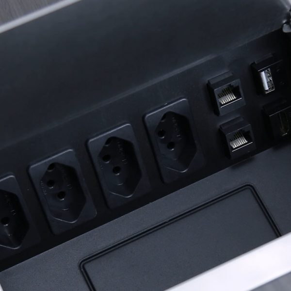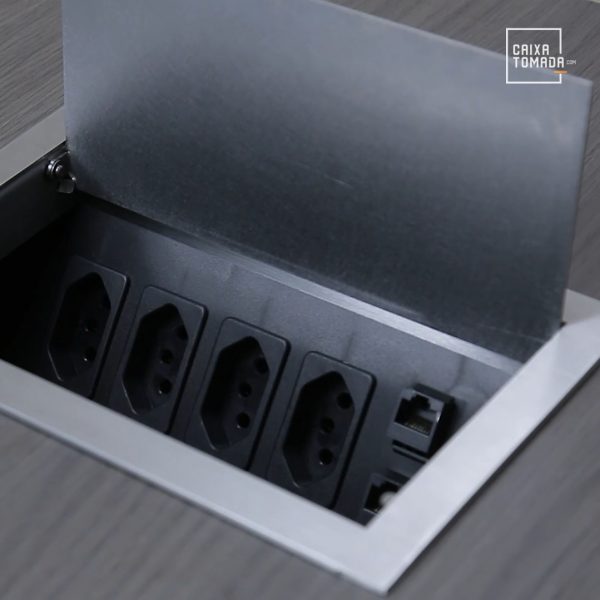 Com excelente custo-benefício este modelo de caixa tomada pode abrigar 4 módulos de tomada elétrica e até 4 módulos que podem ser compostos por blocos de HDMI, USB Dados, USB Carregador, RJ-45 (rede), RJ-11 (telefone), etc. O modelo possui tampa retrátil em aço escovado INOX com abertura para passagem de fiação e sistema de calha para os módulos em ABS. As conexões possuem sistema totalmente modular, ou seja, o usuário conforme sua necessidade pode definir quais blocos serão instalados.