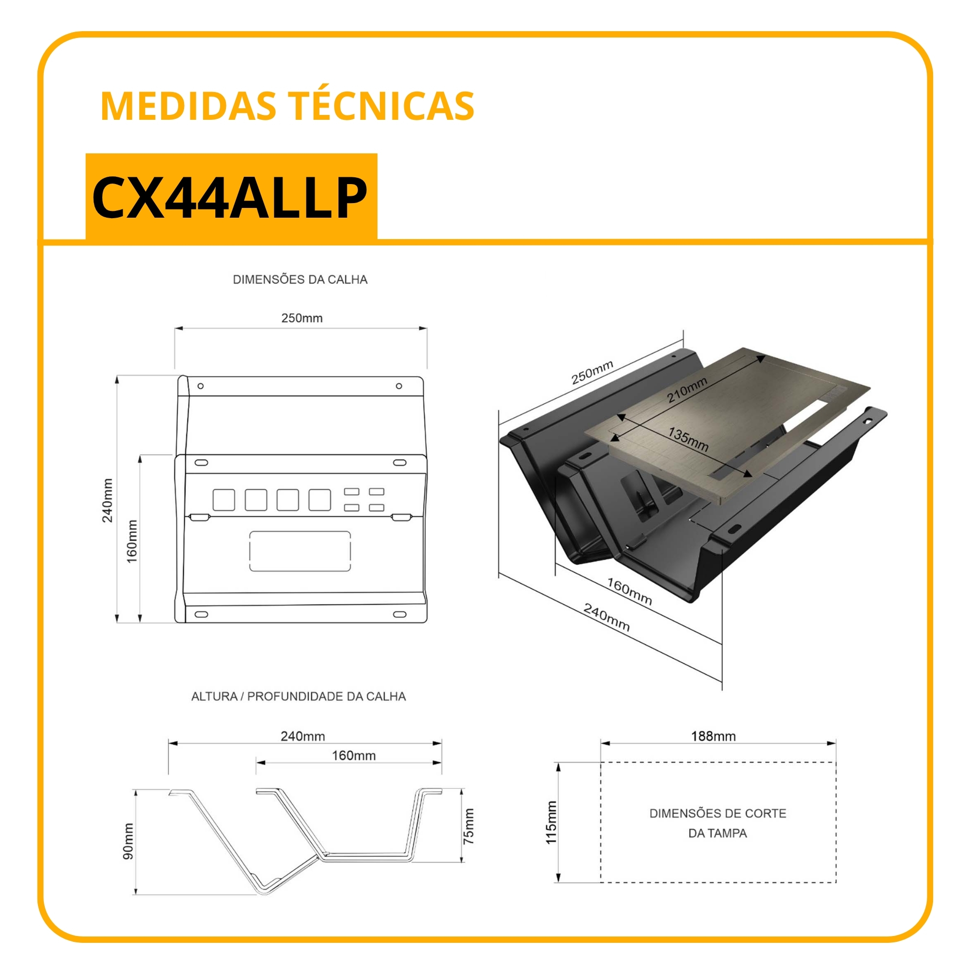 Com excelente custo-benefício este modelo de caixa tomada pode abrigar 4 módulos de tomada elétrica e até 4 módulos que podem ser compostos por blocos de HDMI, USB Dados, USB Carregador, RJ-45 (rede), RJ-11 (telefone), etc. O modelo possui tampa retrátil em aço escovado INOX com abertura para passagem de fiação e sistema de calha para os módulos em ABS. As conexões possuem sistema totalmente modular, ou seja, o usuário conforme sua necessidade pode definir quais blocos serão instalados.