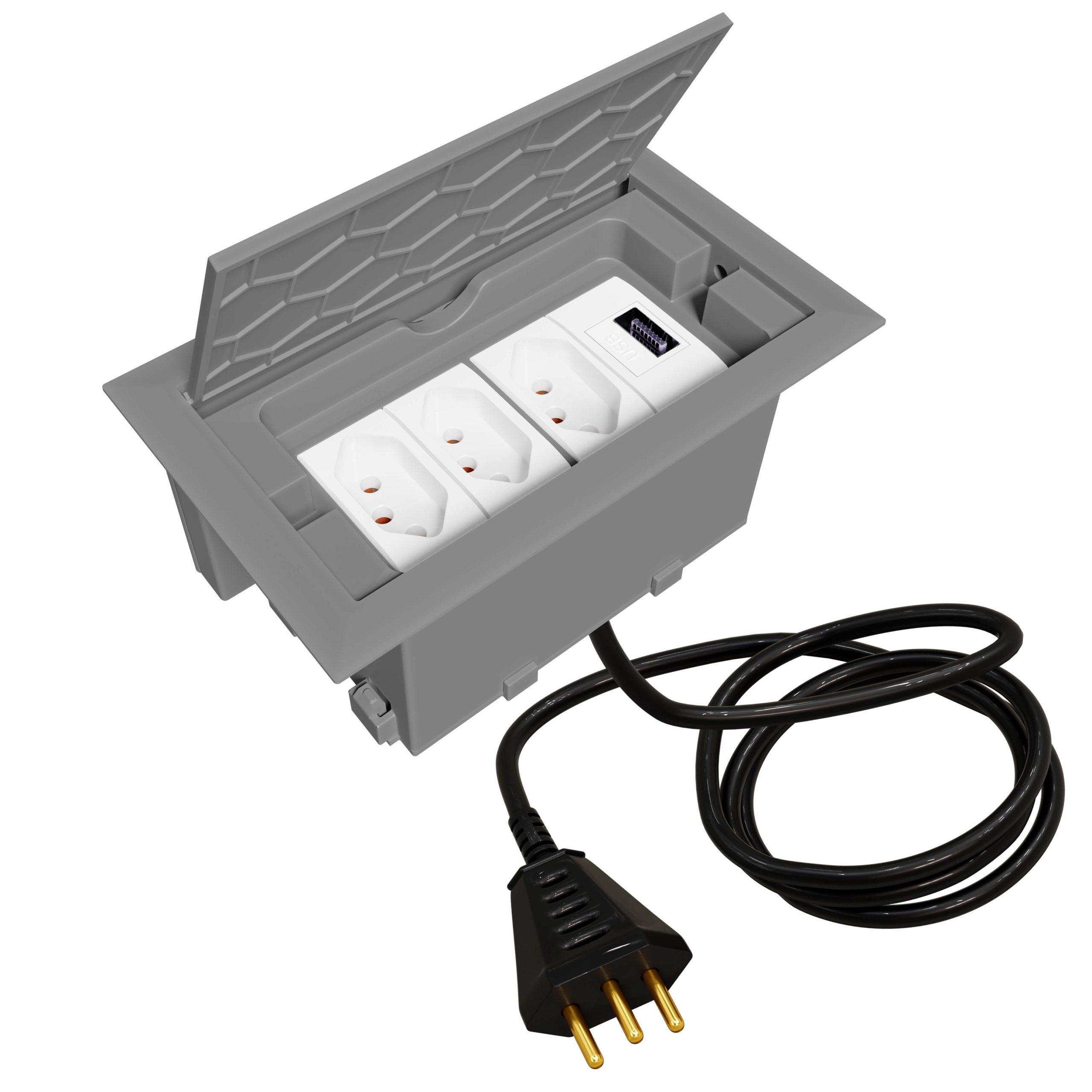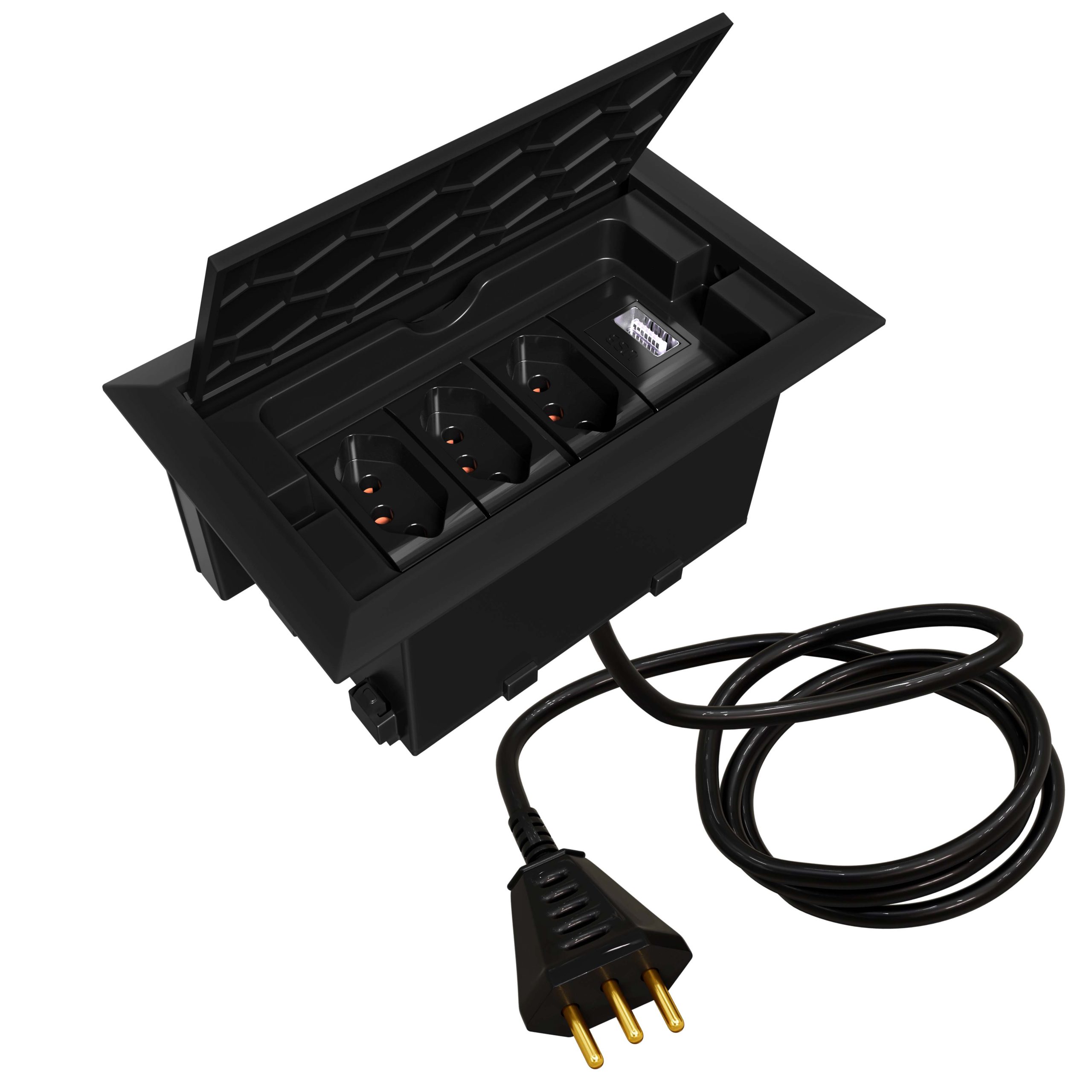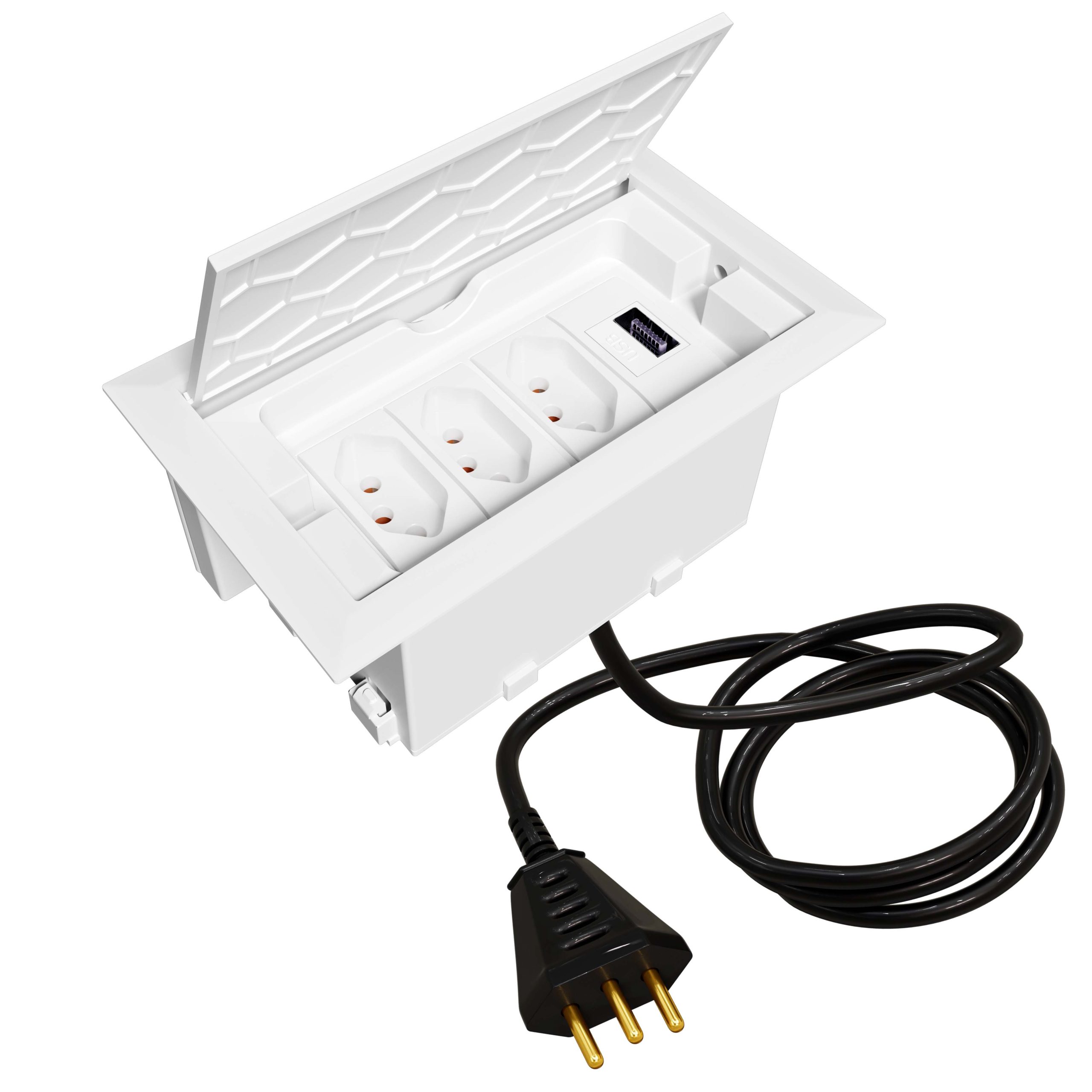 Com excelente custo-benefício este modelo de caixa tomada possui 3 tomadas 10A (ideal para celular, notebook, impressora, tablet, etc) + 1 USB Carregador 10W e cabo plug (1,5 metros) para você ligar e usar. O modelo possui tampa retrátil que quando aberta fica oculta dentro da caixa.