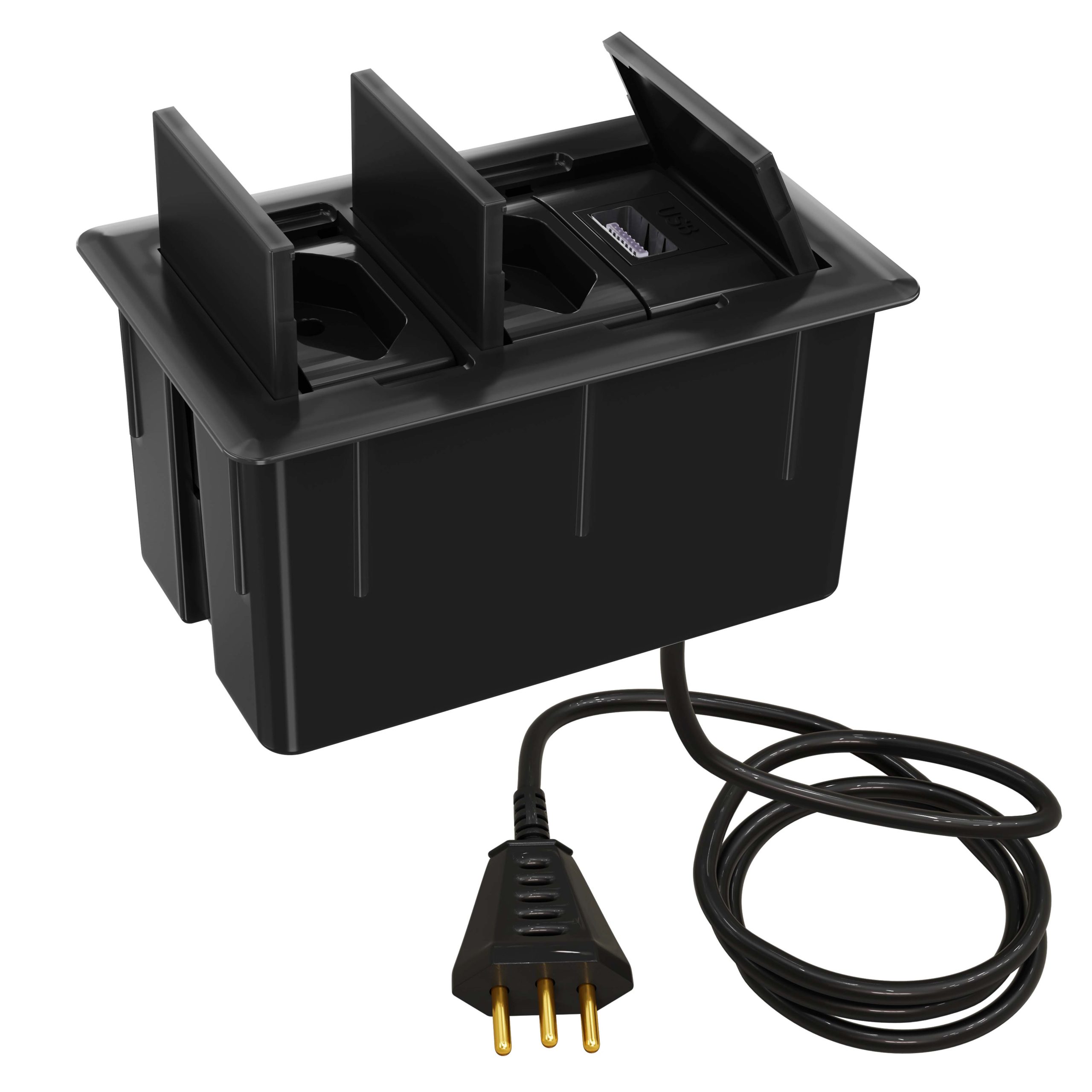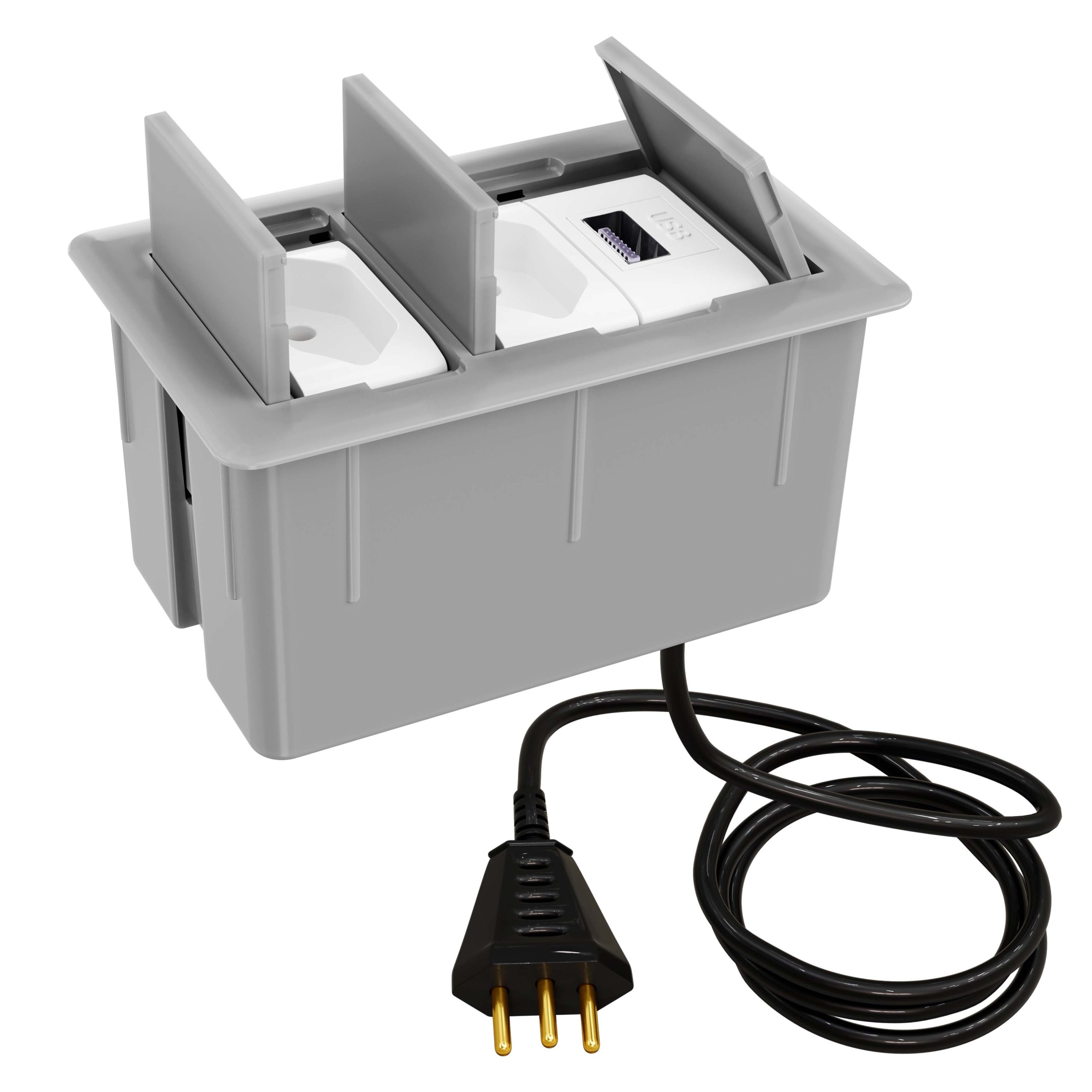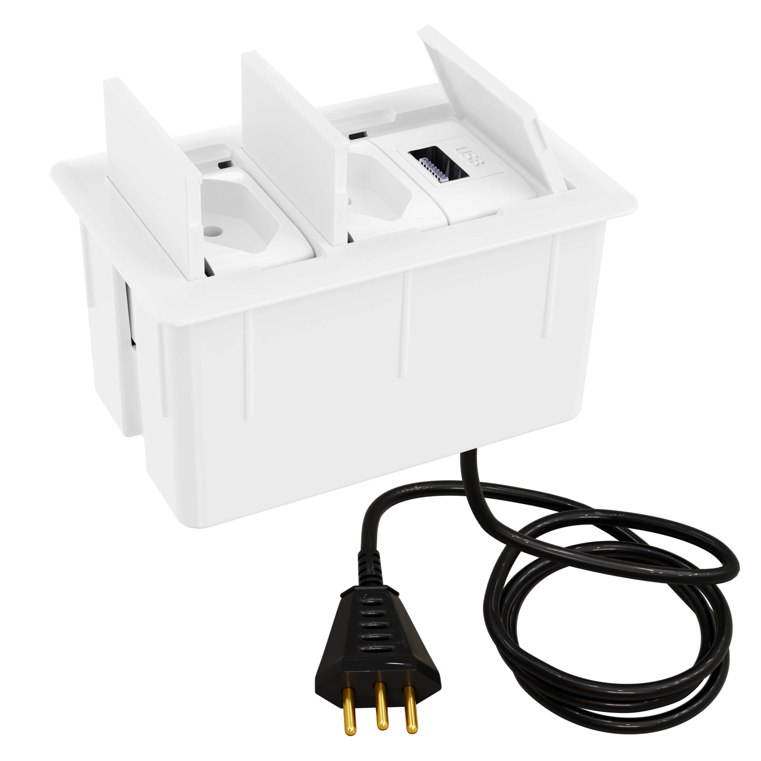 Com excelente custo-benefício este modelo de caixa tomada possui 2 tomadas 10A (ideal para celular, notebook, impressora, tablet, etc) + 1 USB Carregador 10W e cabo plug (1,5 metros) para você ligar e usar. O modelo possui 3 tampas retráteis individuais que quando abertas ficam ocultas dentro da caixa.
