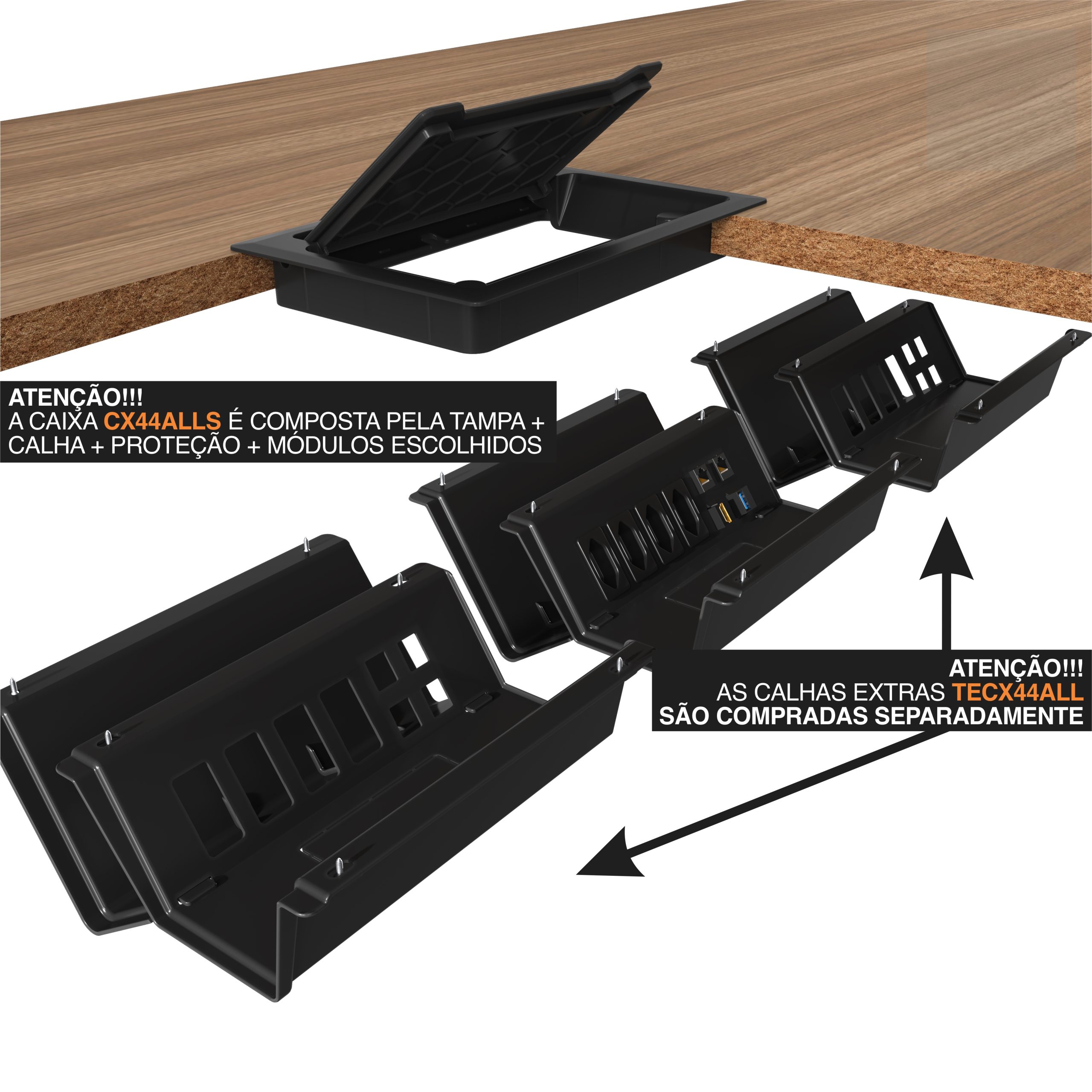 A caixa de tomada CX44ALLS é uma solução conveniente para aumentar a conectividade em qualquer ambiente sem gastar muito. Ela oferece ao usuário a possibilidade de fazer conexões elétricas, de vídeo, dados, rede telefônica, entre outras, de acordo com suas necessidades. É uma ótima opção para esconder fios e cabos e para organizar as conexões de vários equipamentos que precisam ser usados ao mesmo tempo.
