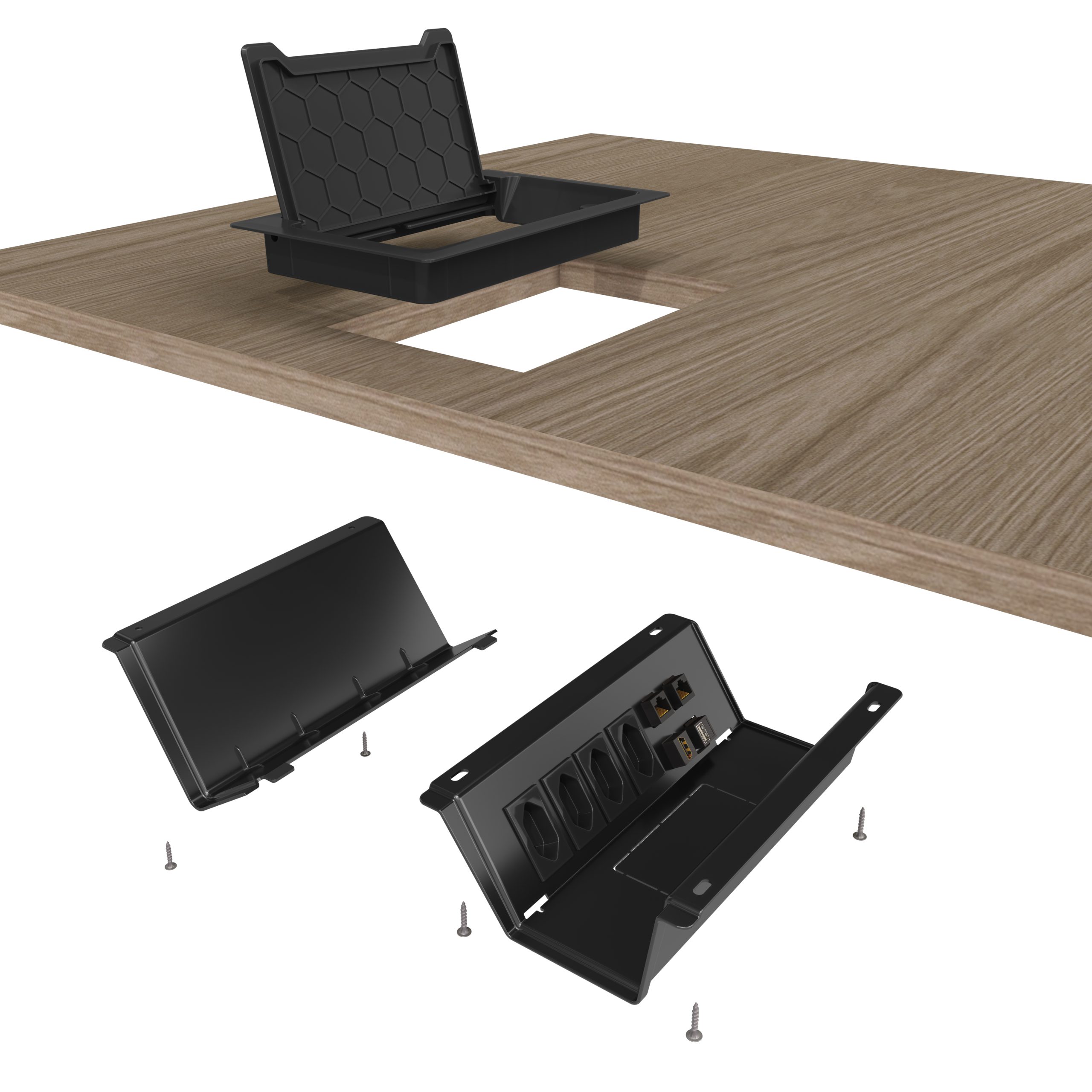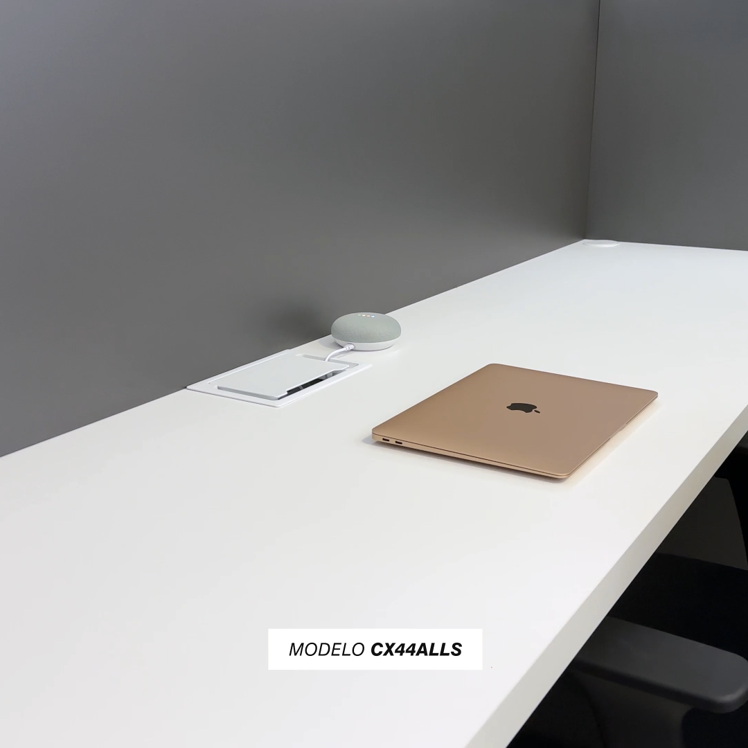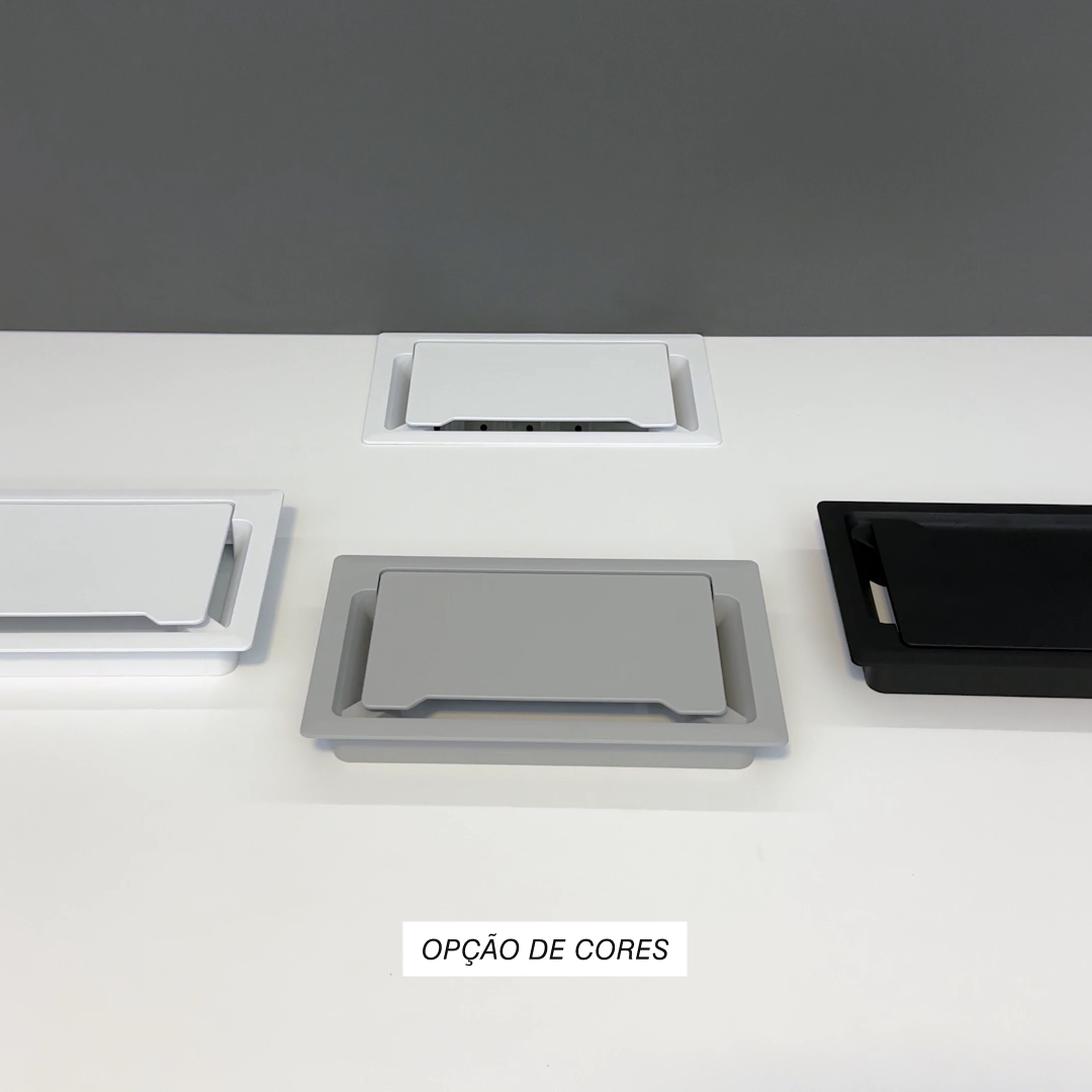 A caixa de tomada para embutir possui cantos retos e fica elegante e discretamente sobreposta ao tampo da mesa. A caixa CX44ALLS está disponível em cores neutras para garantir versatilidade em qualquer ambiente home ou office. A tampa basculante também facilita o acesso às conexões. A instalação é fácil em qualquer tampo de mesa e garante que você possa trabalhar sem se preocupar com cabos de equipamentos eletrônicos.