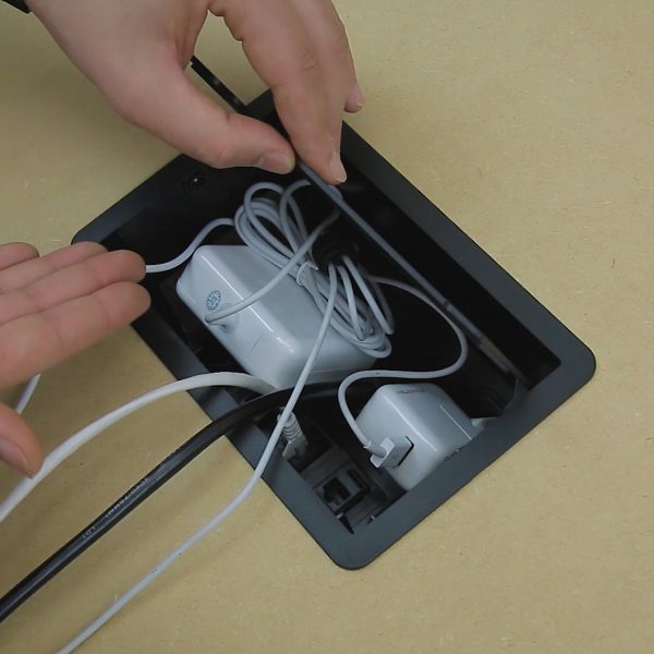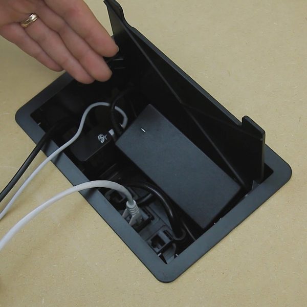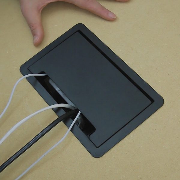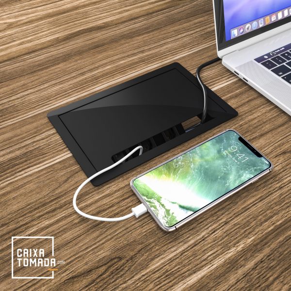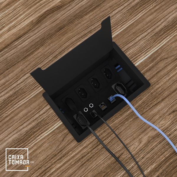 A caixa possui um colarinho com bordas finas que se sobrepõe ao tampo da mesa, proporcionando um acabamento discreto. Sua tampa basculante apresenta um design sóbrio que permite que as tomadas e módulos fiquem ocultos quando não estão em uso ou quando está com cabos/carregadores conectados. Se você busca conectividade e versatilidade em seu ambiente de trabalho, a caixa CX63 é a escolha ideal. Com ela, é possível transformar qualquer espaço em um ambiente de trabalho conectado, funcional e organizado.