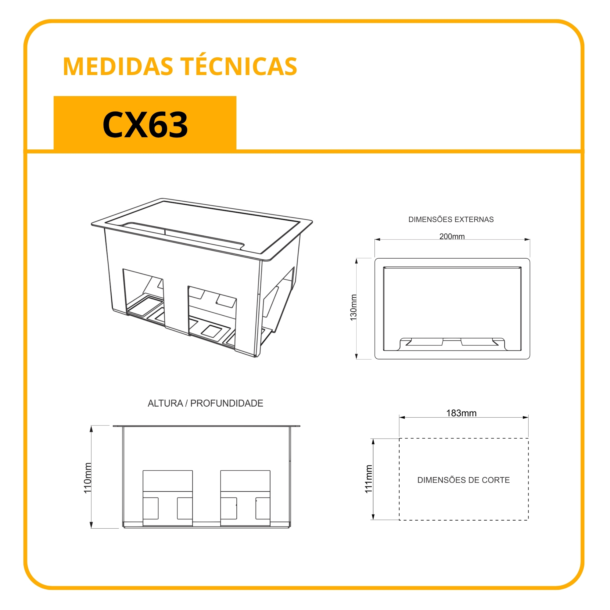 – Dimensional de corte para instalação: 111mm (L) x 110mm (P) x 183mm (C)