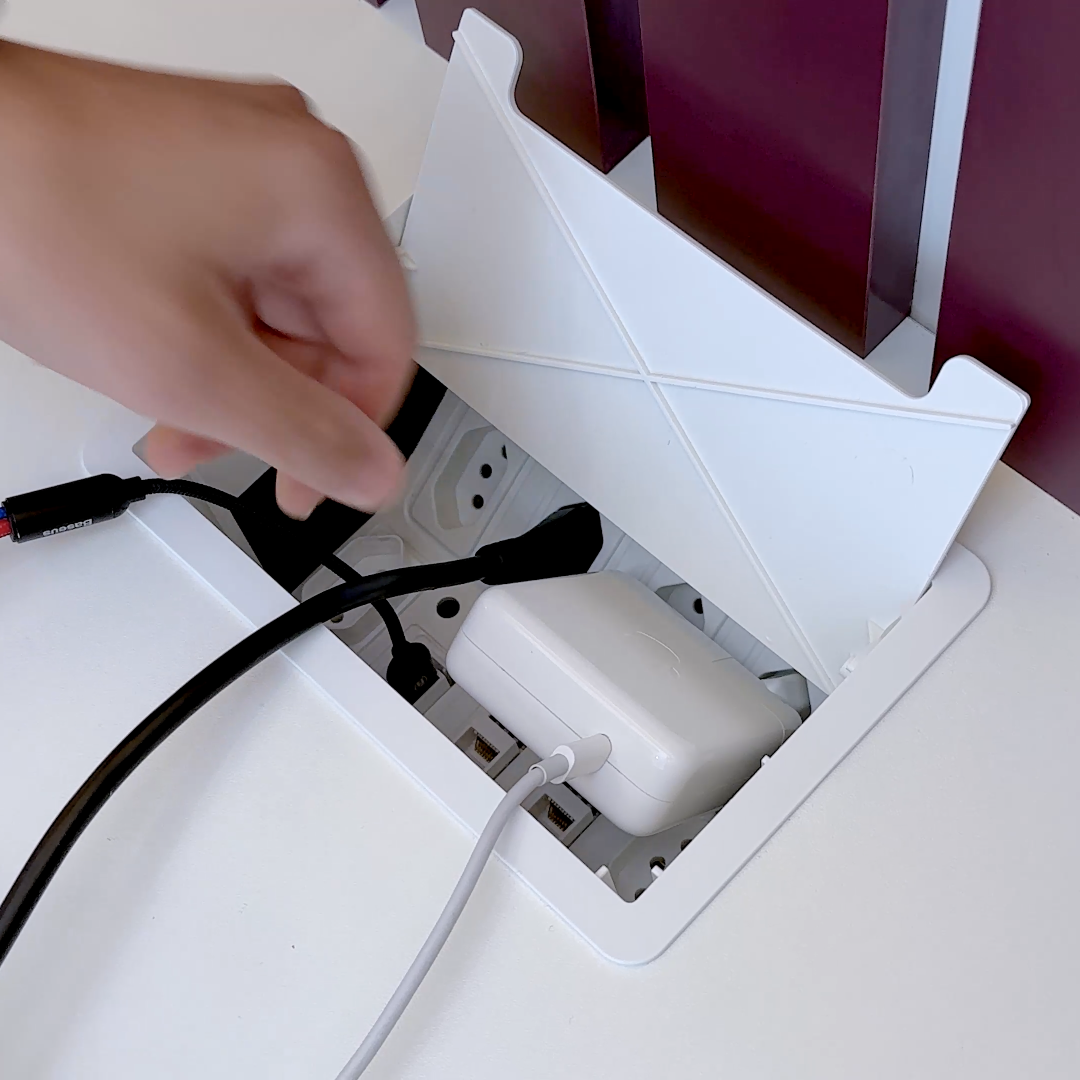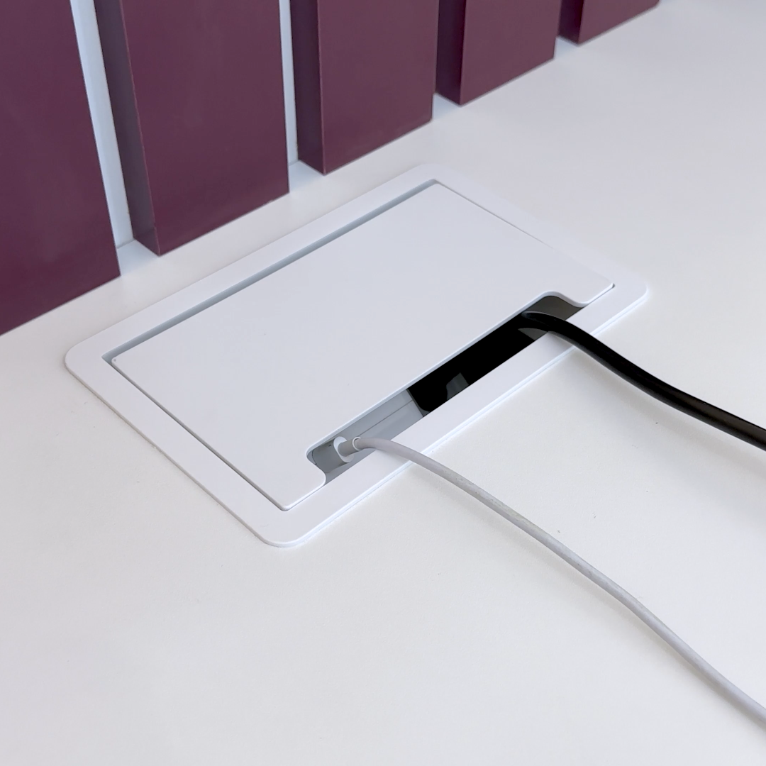 A caixa possui um colarinho com bordas finas que se sobrepõe ao tampo da mesa, proporcionando um acabamento discreto. Sua tampa basculante apresenta um design sóbrio que permite que as tomadas e módulos fiquem ocultos quando não estão em uso ou quando está com cabos/carregadores conectados. Se você busca conectividade e versatilidade em seu ambiente de trabalho, a caixa CX63 é a escolha ideal. Com ela, é possível transformar qualquer espaço em um ambiente de trabalho conectado, funcional e organizado.