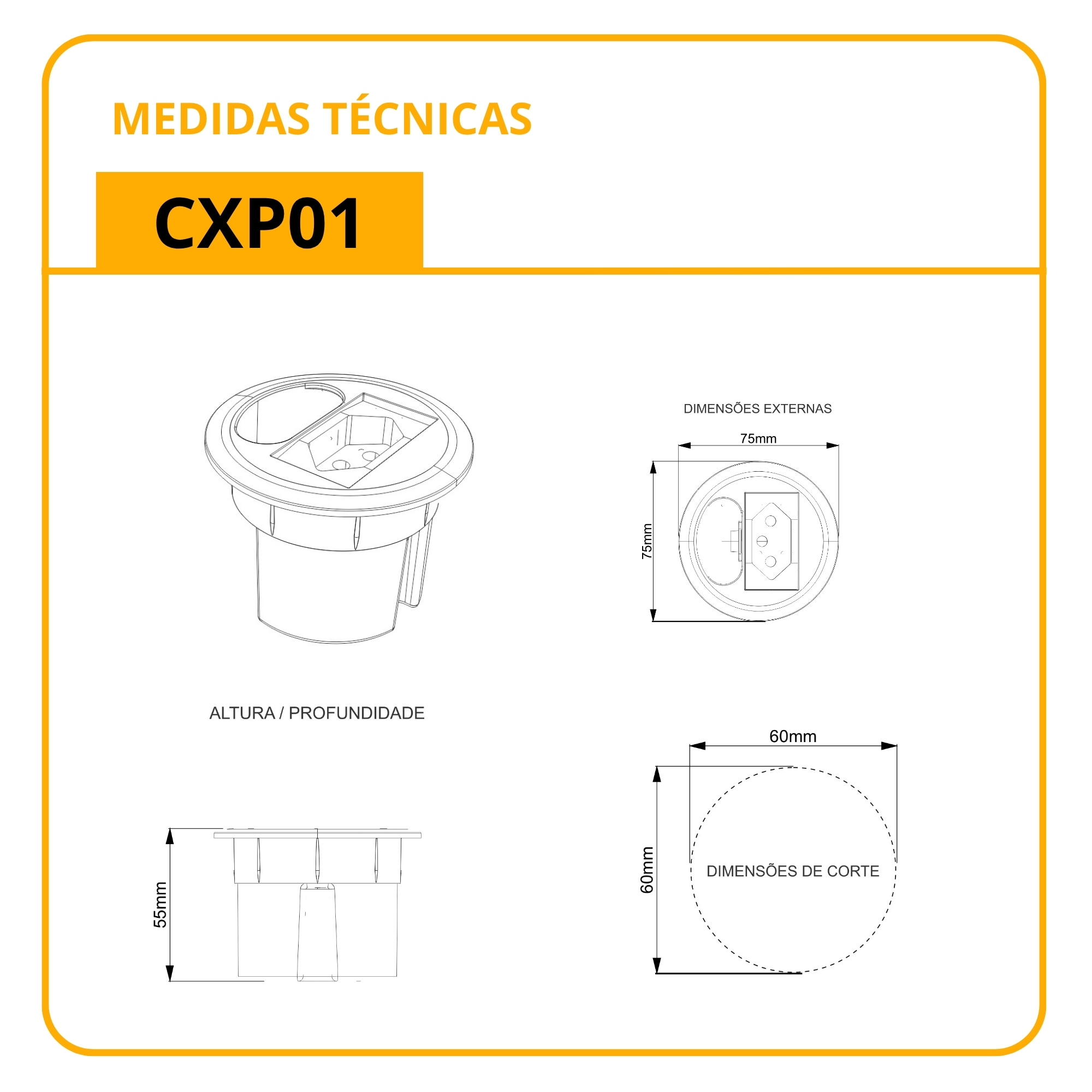 Caixa de Tomada Passa-Cabos CXP01: organização, conectividade e acabamento discreto para móveis e bancadas