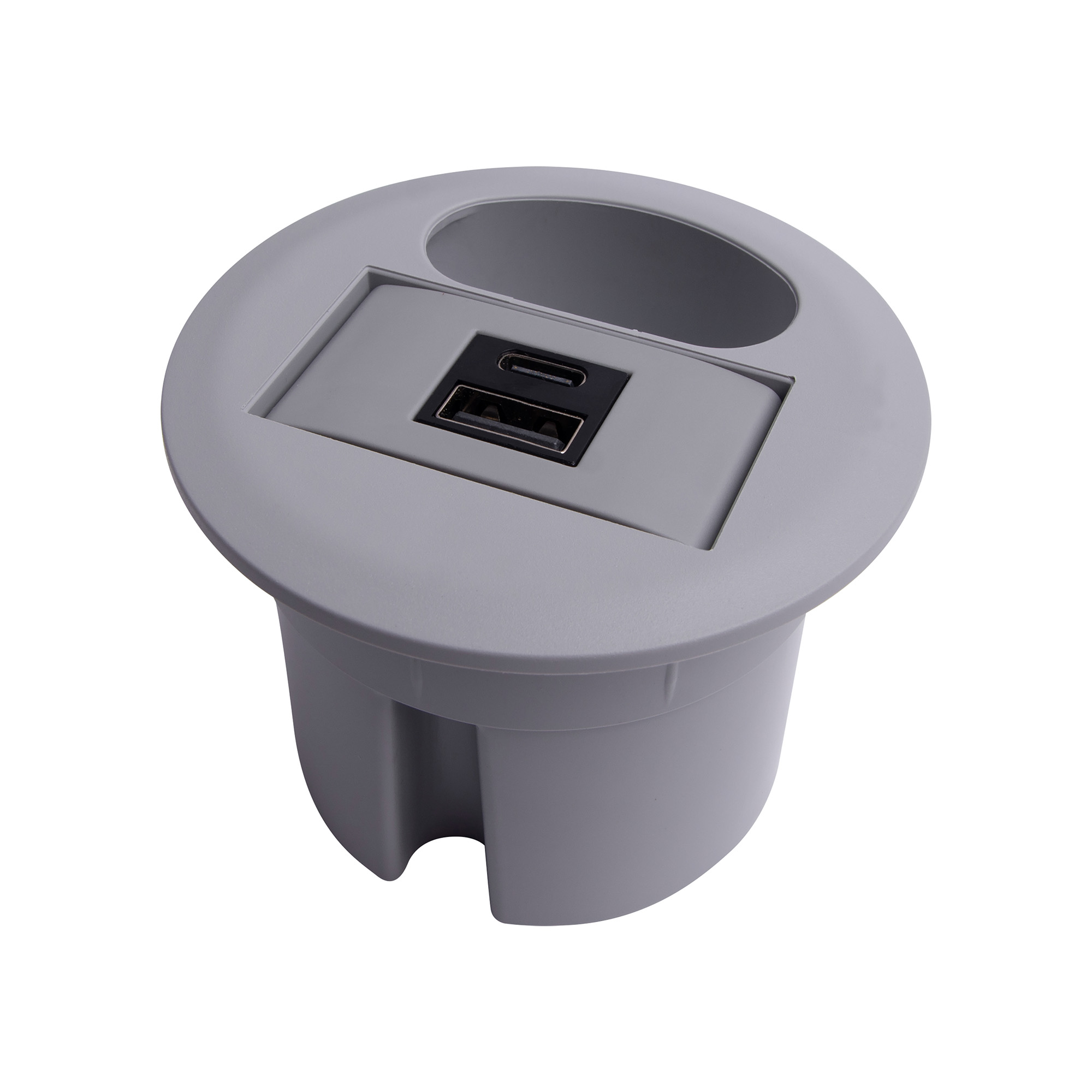 A CXP01 foi projetada para encaixar em furo padrão de passa-cabos (60mm), o que amplia significativamente sua versatilidade. Isso permite substituir facilmente um passa-cabos convencional por uma solução muito mais funcional, sem a necessidade de grandes alterações no móvel.