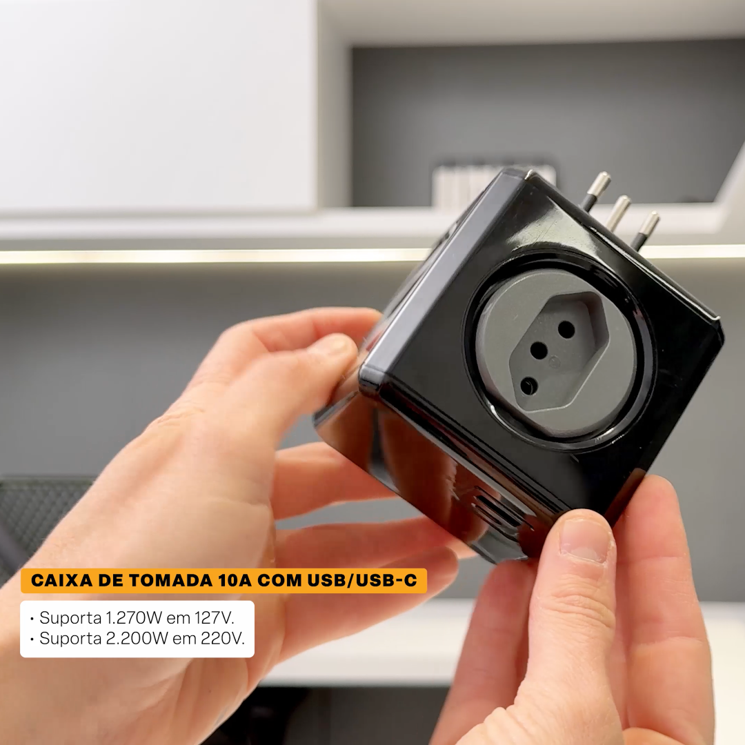 Conectividade: 4 tomadas 10A + USB + USB-C