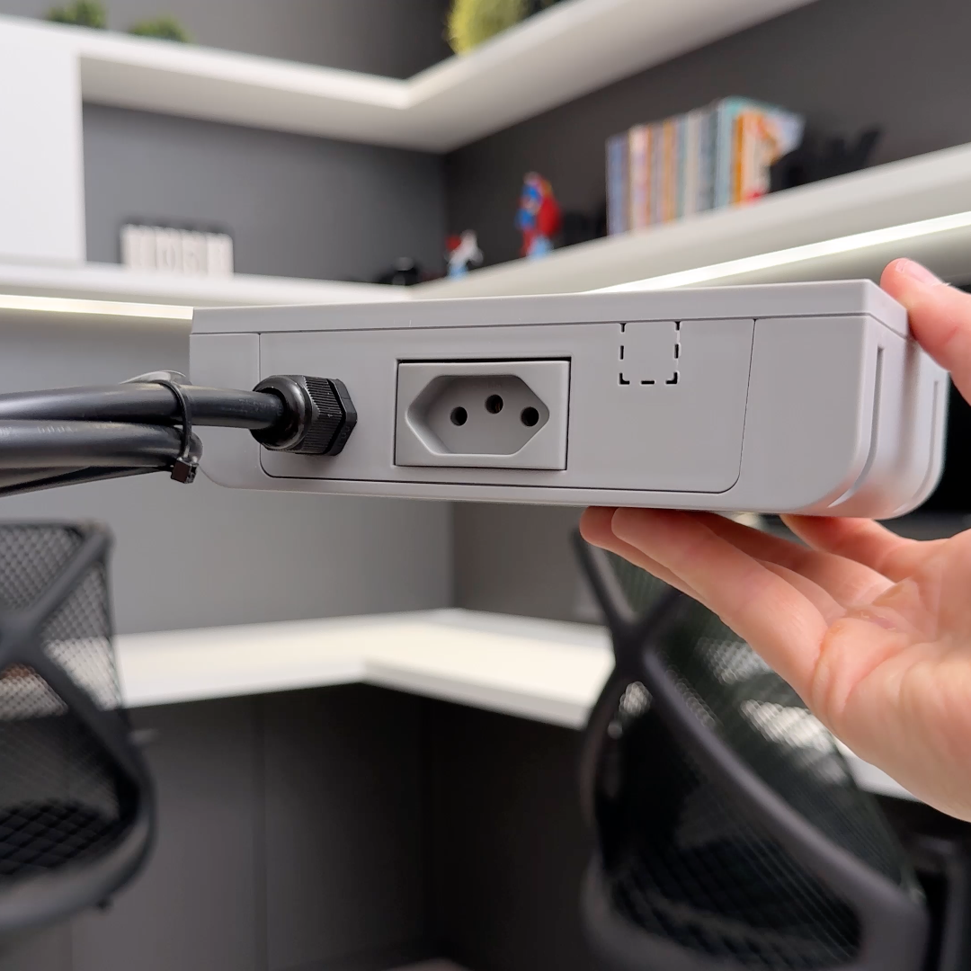Tudo isso sem a necessidade de furar, cortar ou modificar o tampo ou mesa — basta fixar a caixa na parte inferior do móvel e utilizar normalmente.