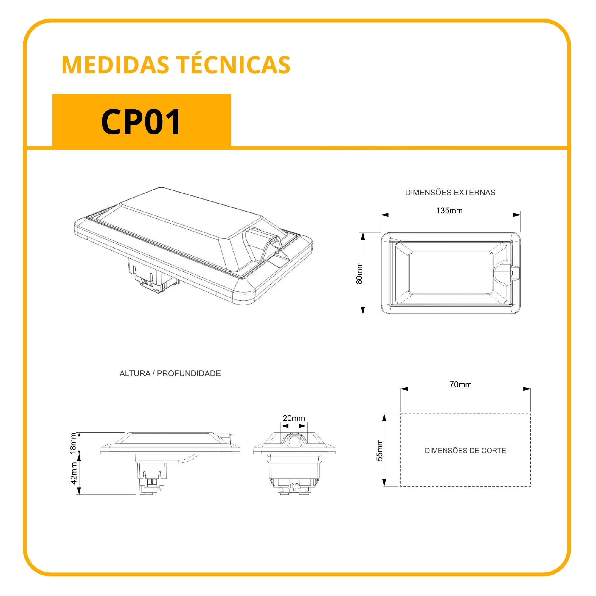 – Dimensional de corte para instalação: 55mm (L) x 42mm (P) x 70mm (C)