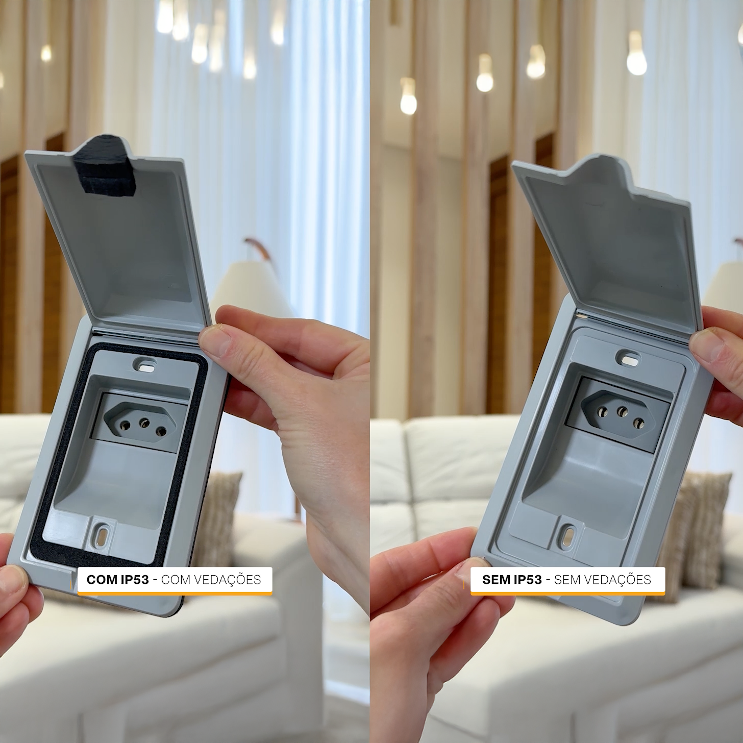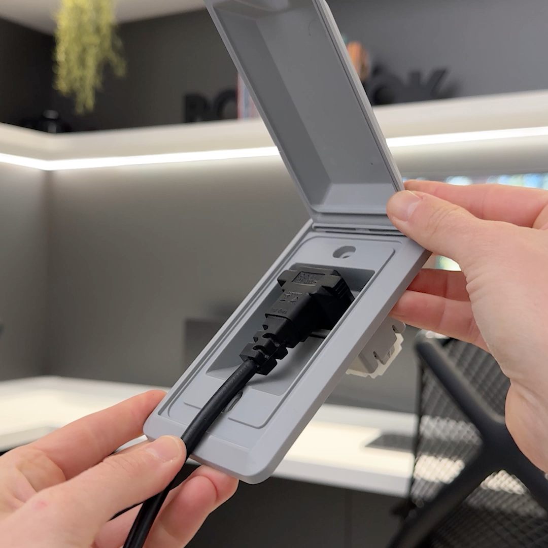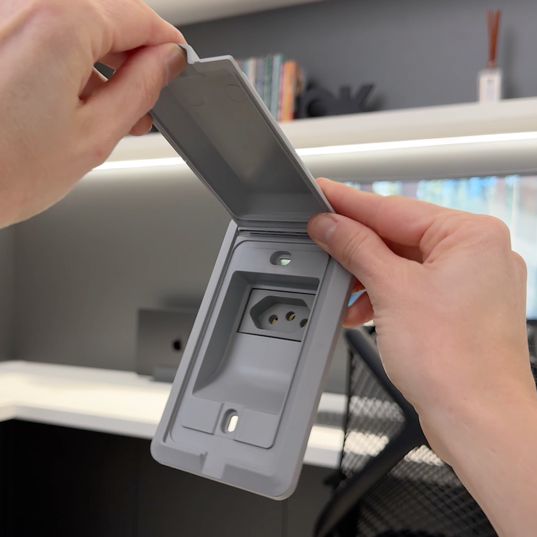 Com tampa retrátil, o modelo permite o fechamento mesmo com o plug conectado (desde que seja em ângulo de 90°), mantendo o ambiente clean, organizado e com mais segurança — especialmente importante para quem tem crianças ou pets em casa/apto.