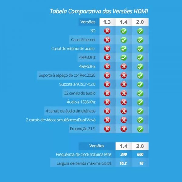 O HDMI 2.0 é a versão mais recente do padrão de interface multimídia de alta definição (HDMI) que suporta uma resolução máxima de 4K a 60Hz, o que significa que é capaz de transmitir imagens de alta qualidade e áudio de alta qualidade, como som surround, em um único cabo. O cabo HDMI 2.0 é compatível com uma ampla gama de dispositivos, incluindo TVs de alta definição, consoles de jogos, players de mídia, entre outros.