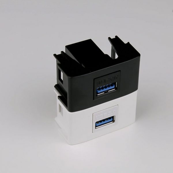 Os módulos USB 3.0 incluem uma conexão USB 3.0 fêmea que permite conectar um cabo USB 3.0 macho na parte traseira do módulo, que se conecta a outros dispositivos compatíveis com USB 3.0. Eles são frequentemente usados em aplicações de home office, salas de conferência e sistemas de áudio e vídeo profissionais para simplificar a instalação e organização dos cabos USB. O módulo USB 3.0 permite você conectar a sua caixa de tomada a um computador ou smart TV para transferir dados entre os terminais e até mesmo carregar (de forma lenta) dispositivos móveis conectados ao módulo.