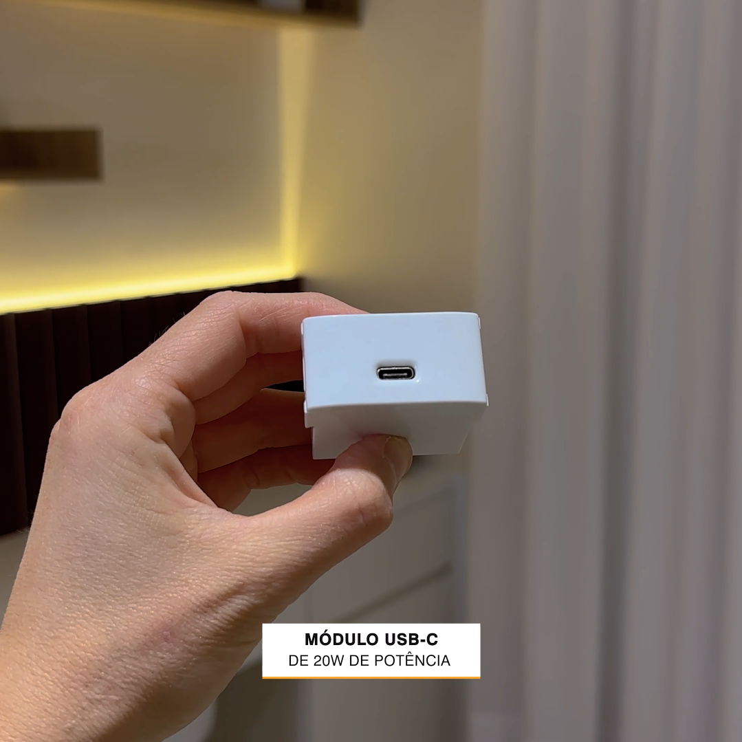 O módulo USB-C carregador é utilizado em ambientes comerciais e residenciais, em projetos de cabeamento estruturado, permitindo a conexão de dispositivos eletrônicos em diferentes locais, como escritórios, salas de reunião, residências e outros ambientes.