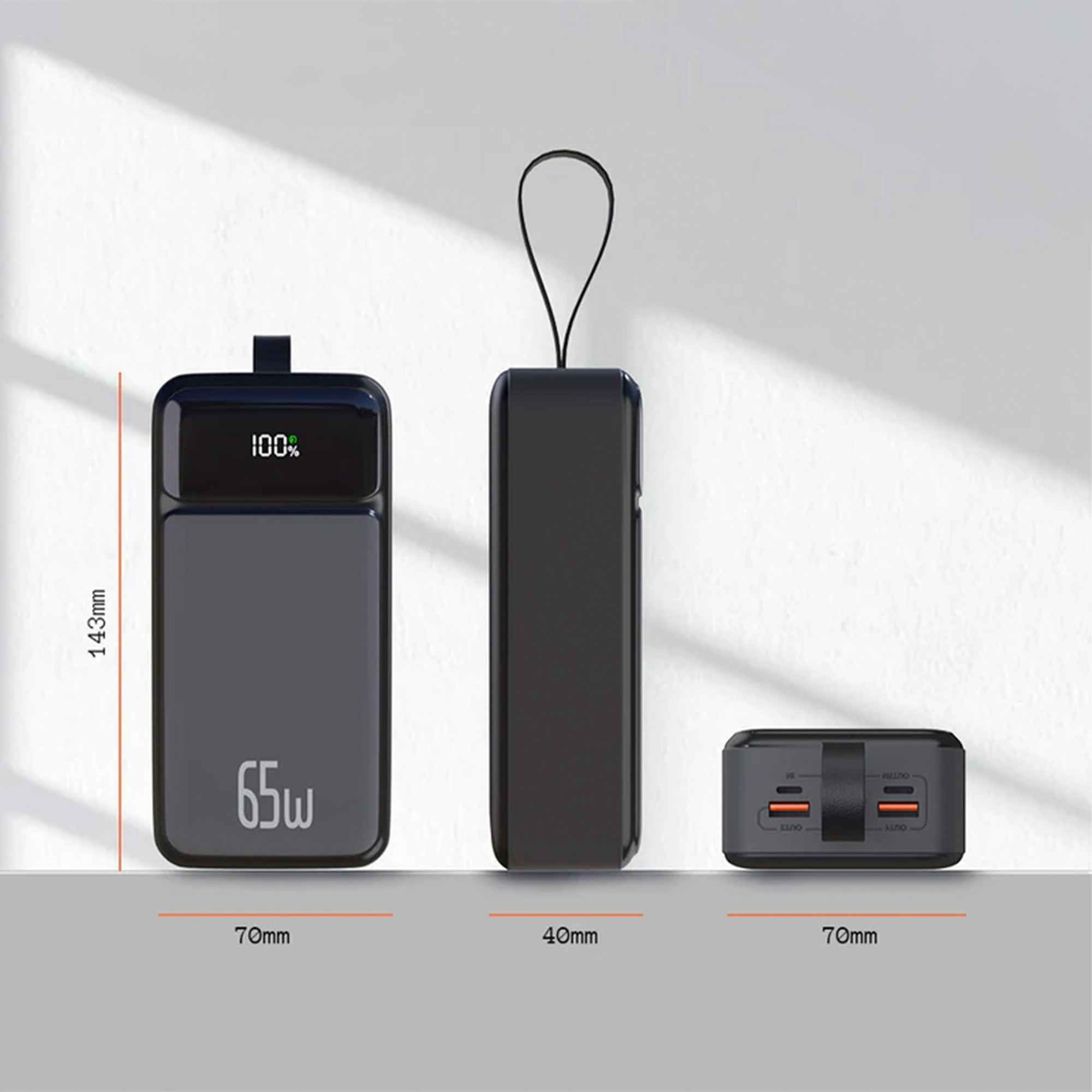 Com uma impressionante capacidade de 30.000 mAh, esta power bank garante múltiplas cargas para seus smartphones, tablets e até mesmo MacBooks. A saída de 65W de potência permite o carregamento rápido de dispositivos compatíveis, significando menos tempo esperando e mais tempo usando. Recarregue seu notebook durante viagens, dê um boost rápido no seu celular antes de uma reunião importante, ou mantenha todos os seus gadgets funcionando durante longos dias fora de casa ou do escritório.