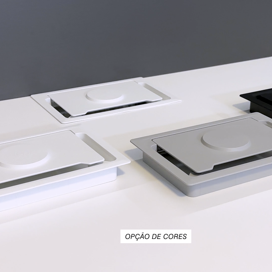 Esta caixa tomada é indicada para montagem em mesas de reunião, salas de conferência, salas de treinamento, showrooms e escritórios. O produto proporciona ao usuário praticidade na hora de fazer as conexões elétricas, de vídeo, de dados e rede.