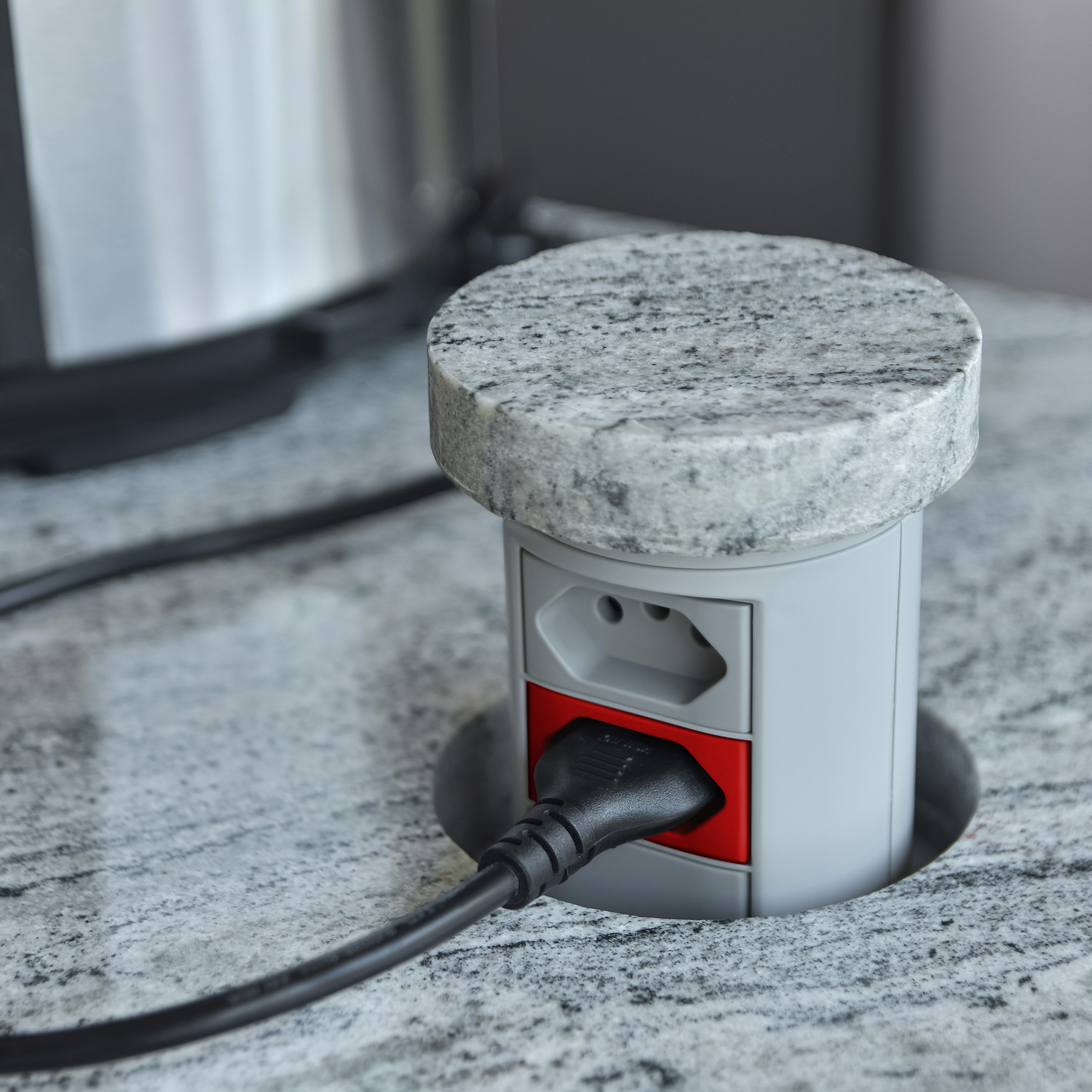 Este modelo, especificamente, conta com 1 tomadas flex + 1 tomada flex vermelha +1 espelho cego. Isso permite que a torre seja embutida diretamente em bancadas de granito, mármore, quartzo ou outros materiais semelhantes, utilizando o mesmo revestimento da bancada no topo da torre, sem comprometer o acesso às tomadas. Esse detalhe garante um resultado final ainda mais elegante, funcional e discreto.