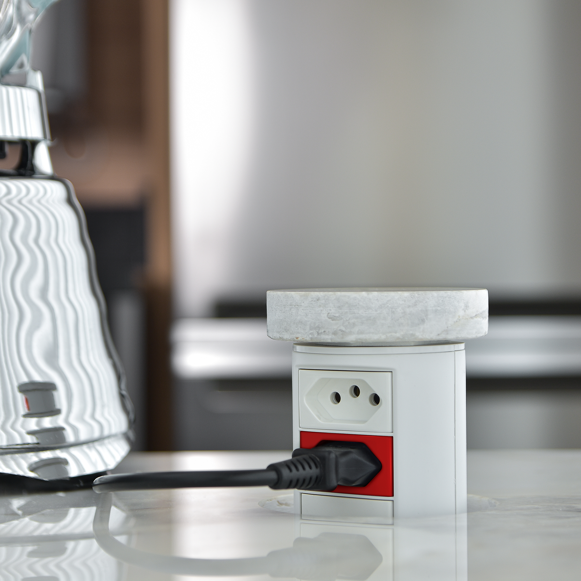 Com apenas um toque (apertar) em sua tampa, a torre é acionada e as tomadas sobem automaticamente, proporcionando acesso rápido e fácil às conexões elétricas necessárias. Após o uso, basta empurrá-la para baixo e o seu corpo fica totalmente escondido dentro da bancada ou móvel onde foi instalada, deixando o espaço organizado e sem cabos aparentes.