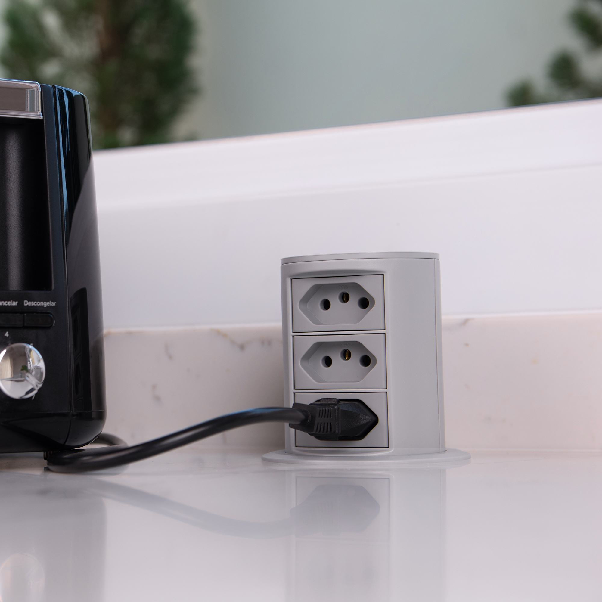Com apenas um toque (apertar) em sua tampa, a torre é acionada e as tomadas sobem automaticamente, proporcionando acesso rápido e fácil às conexões elétricas necessárias. Após o uso, basta empurrá-la para baixo e o seu corpo fica totalmente escondido dentro da bancada ou móvel onde foi instalada, deixando o espaço organizado e sem cabos aparentes.